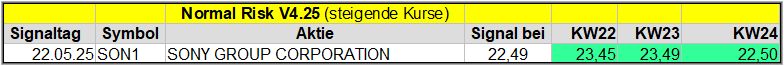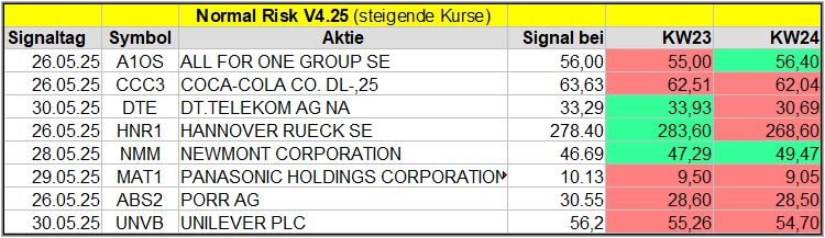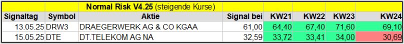 Den Kursverlauf der einzelnen Werte verfolge ich ab einem generierten Signal, über einen Zeitraum von 4 Wochen und mit einem wöchentlichen Update. (Kursiv geschriebene Texte sind in der Regel Texte aus der Vergangenheit bzw. sind Hinweise.)