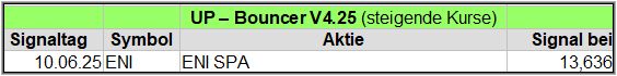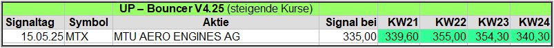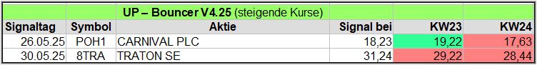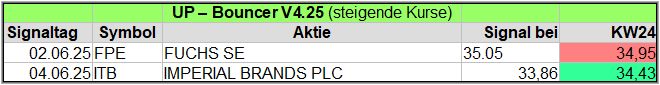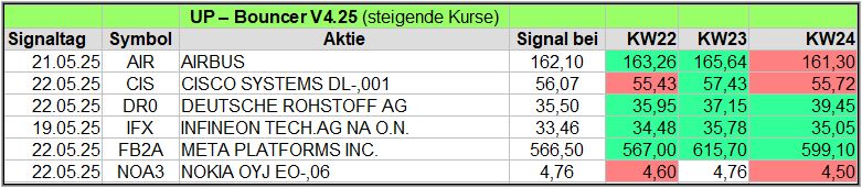 Nachfolgend die fortlaufenden UP-Bouncer-Ergebnisse der vergangenen 4 Wochen anhand denen jeder selbst prüfen kann, wie erfolgreich die eigene Auswahl aus den angebotenen Signal-Werten gewesen wäre.