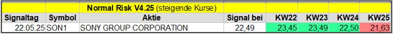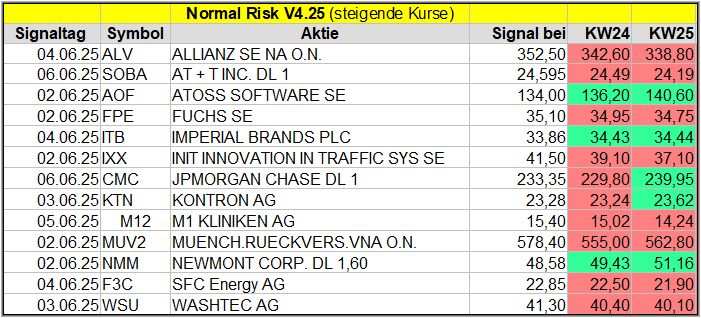 Den Kursverlauf der einzelnen Werte verfolge ich ab einem generierten Signal, über einen Zeitraum von 4 Wochen und mit einem wöchentlichen Update. (Kursiv geschriebene Texte sind in der Regel Texte aus der Vergangenheit bzw. sind Hinweise.)