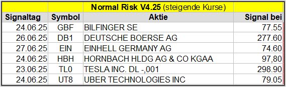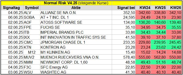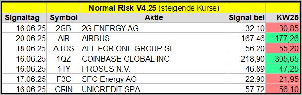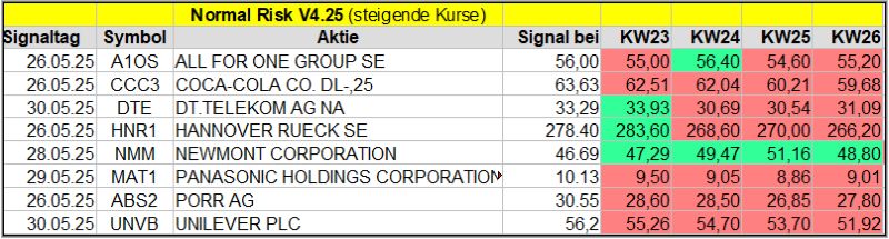 Den Kursverlauf der einzelnen Werte verfolge ich ab einem generierten Signal, über einen Zeitraum von 4 Wochen und mit einem wöchentlichen Update. (Kursiv geschriebene Texte sind in der Regel Texte aus der Vergangenheit bzw. sind Hinweise.)