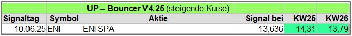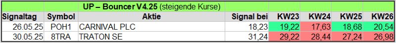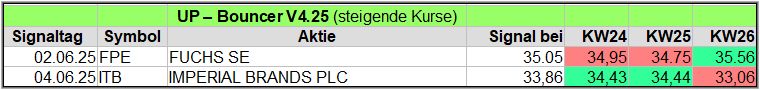 Nachfolgend die fortlaufenden UP-Bouncer-Ergebnisse der vergangenen 4 Wochen anhand denen jeder selbst prüfen kann, wie erfolgreich die eigene Auswahl aus den angebotenen Signal-Werten gewesen wäre.