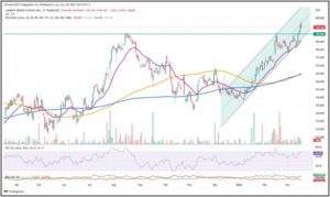 Der Kurs befindet sich in einem steigenden Trendkanal, der seit ca. dem Jahreswechsel 2022 / 23 aktiv ist und er hatte am Freitag ein Tageshoch von rund 198€ erreicht, bevor er auf den Schlusskurs von 194,14€ nachgab.