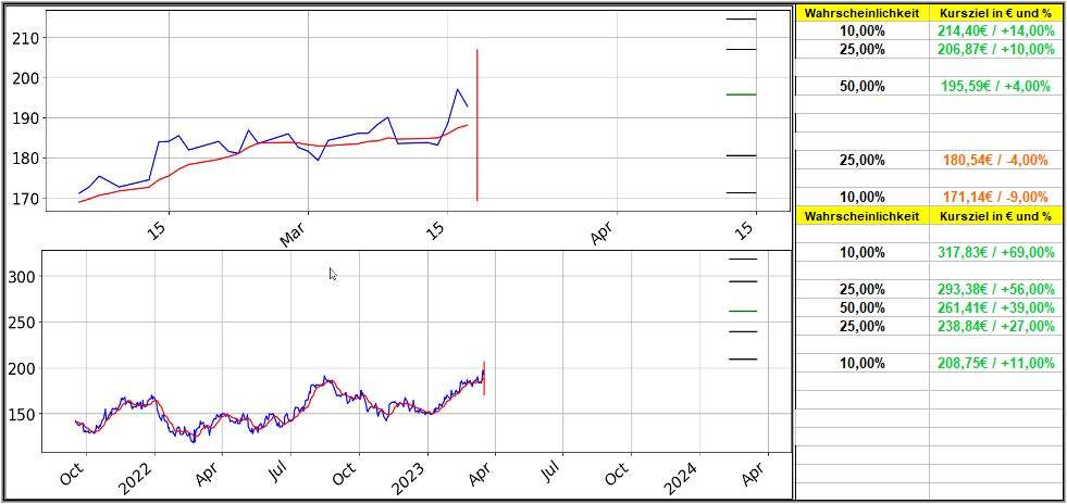 - Wahrscheinlichkeit 25%: hier wäre eine Kursschwankung zwischen 180,54€ (-4,00%) nach unten und auf 206,87€ (+10%) nach oben möglich.
