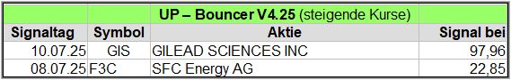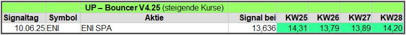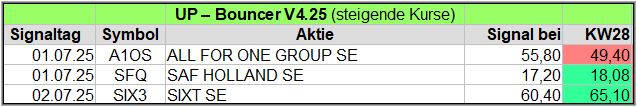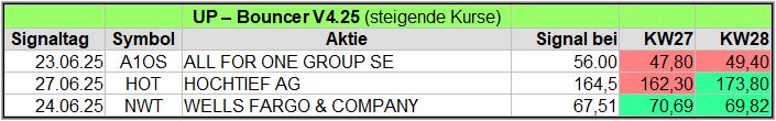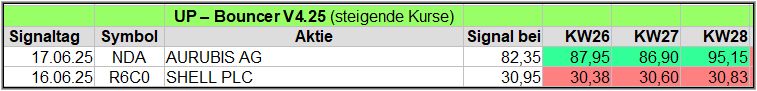 Nachfolgend die fortlaufenden UP-Bouncer-Ergebnisse der vergangenen 4 Wochen anhand denen jeder selbst prüfen kann, wie erfolgreich die eigene Auswahl aus den angebotenen Signal-Werten gewesen wäre.