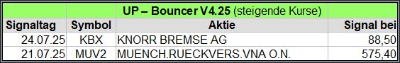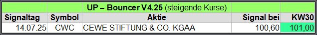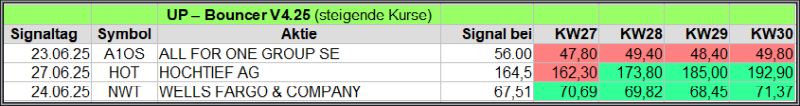 Nachfolgend die fortlaufenden UP-Bouncer-Ergebnisse der vergangenen 4 Wochen anhand denen jeder selbst prüfen kann, wie erfolgreich die eigene Auswahl aus den angebotenen Signal-Werten gewesen wäre.