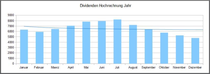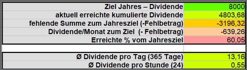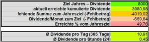 Um das Jahresziel zu erreichen, müssten jetzt in jedem der verbleibenden Monate noch mindestens 639,26€ an Dividende generiert werden, um die fehlenden 3.196€ bis zum Jahresende ausgleichen zu können.