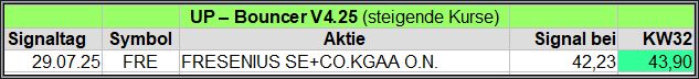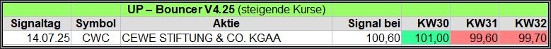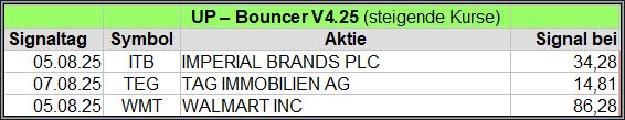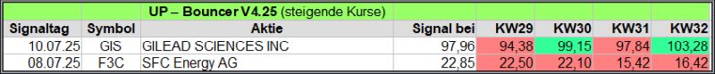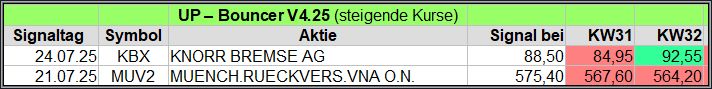 Nachfolgend die fortlaufenden UP-Bouncer-Ergebnisse der vergangenen 4 Wochen anhand denen jeder selbst prüfen kann, wie erfolgreich die eigene Auswahl aus den angebotenen Signal-Werten gewesen wäre.