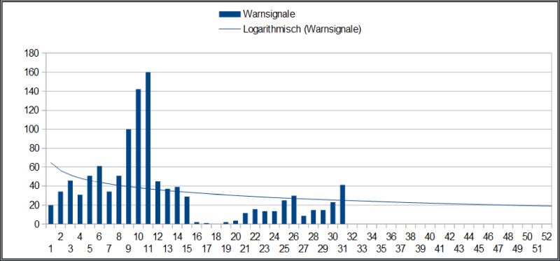 Nachfolgend die Übersicht der Warnsignale je Woche 2025, die nun über der logarithmischen Linie liegen.