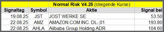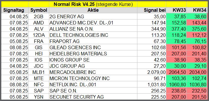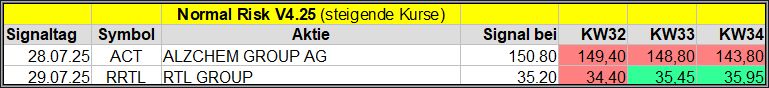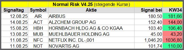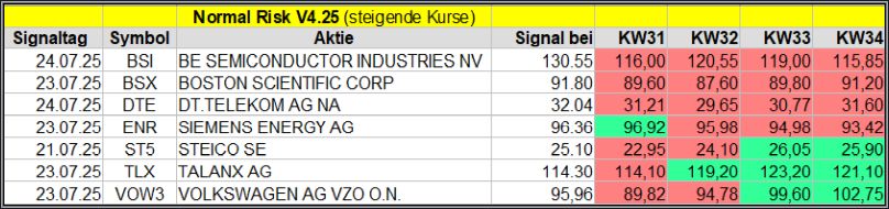 Den Kursverlauf der einzelnen Werte verfolge ich ab einem generierten Signal, über einen Zeitraum von 4 Wochen und mit einem wöchentlichen Update. (Kursiv geschriebene Texte sind in der Regel Texte aus der Vergangenheit bzw. sind Hinweise.)