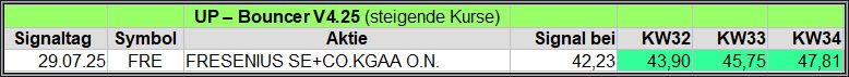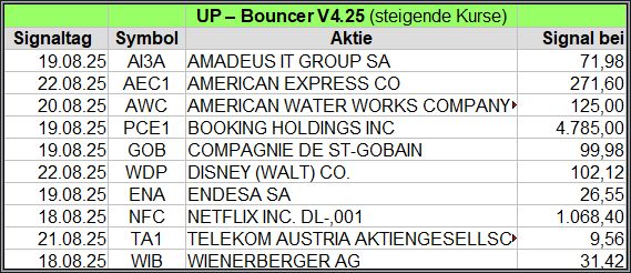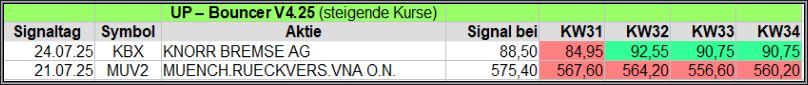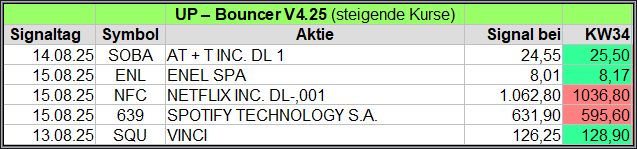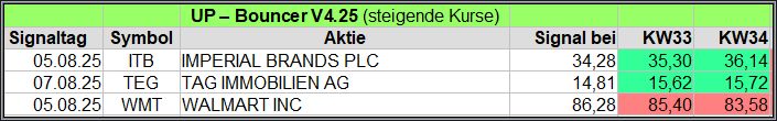 Nachfolgend die fortlaufenden UP-Bouncer-Ergebnisse der vergangenen 4 Wochen anhand denen jeder selbst prüfen kann, wie erfolgreich die eigene Auswahl aus den angebotenen Signal-Werten gewesen wäre.