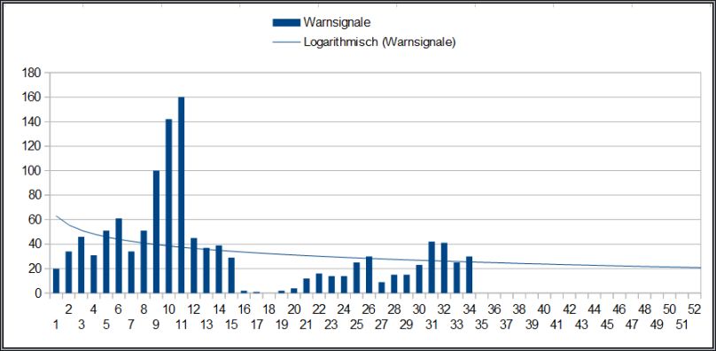 Nachfolgend die Übersicht der Warnsignale je Woche 2025, die nun an der logarithmischen Trendlinie liegen.