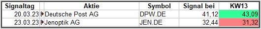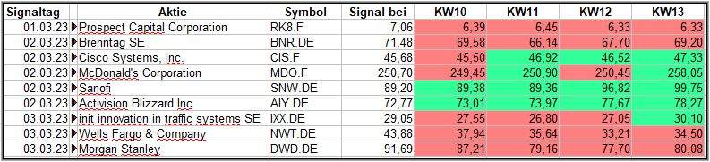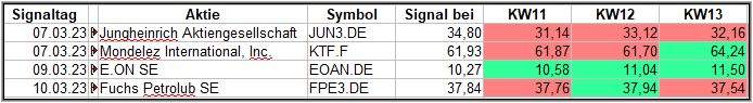 Nun kommen wir zum Update der vorigen Screener-Ergebnisse aus der KW09, KW10, KW11 und KW12, bezogen auf die Schlusskurse in KW13/23. KW08/23 fällt in dieser Woche weg.