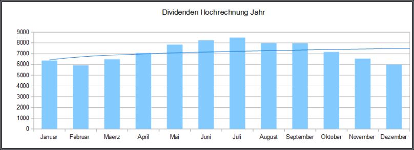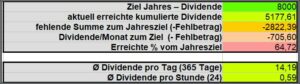 Um das Jahresziel zu erreichen, müssten jetzt in jedem der verbleibenden Monate noch mindestens 676,90€ an Dividende generiert werden, um die fehlenden 2030,69€ bis zum Jahresende ausgleichen zu können.