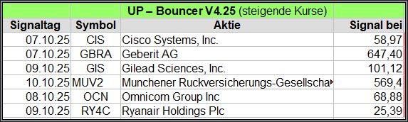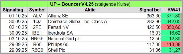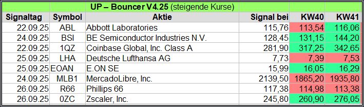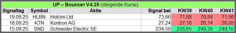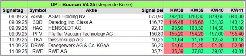 Nachfolgend die fortlaufenden UP-Bouncer-Ergebnisse der vergangenen 4 Wochen anhand denen jeder selbst prüfen kann, wie erfolgreich die eigene Auswahl aus den angebotenen Signal-Werten gewesen wäre.