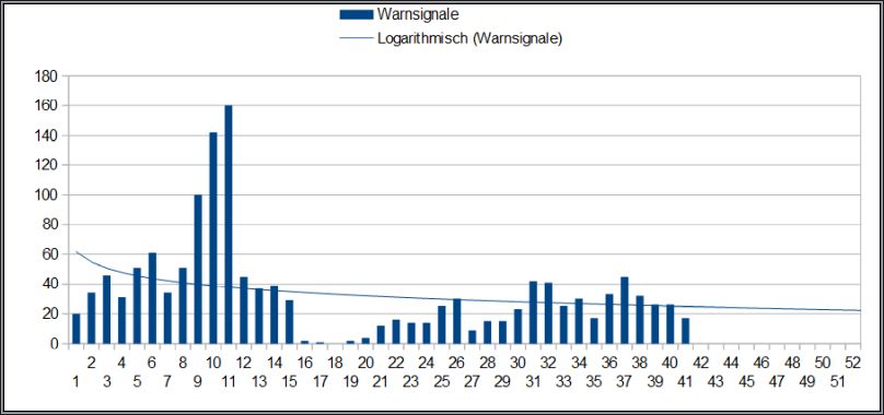 Nachfolgend die Übersicht der Warnsignale je Woche 2025, die nun noch immer über der logarithmischen Trendlinie liegen.