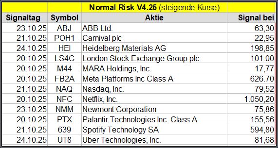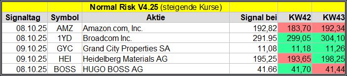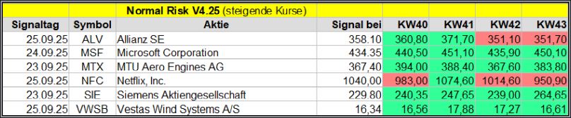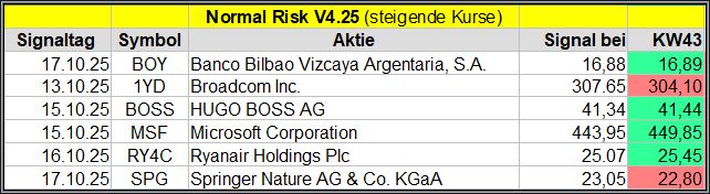 Den Kursverlauf der einzelnen Werte verfolge ich ab einem generierten Signal, über einen Zeitraum von 4 Wochen und mit einem wöchentlichen Update. (Kursiv geschriebene Texte sind in der Regel Texte aus der Vergangenheit bzw. sind Hinweise.)