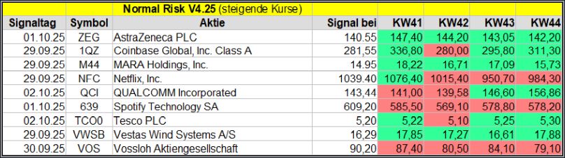 Nachfolgend die fortlaufenden Screener-Ergebnisse der vergangenen 4 Wochen anhand denen jeder selbst prüfen kann, wie erfolgreich die eigene Auswahl aus den angebotenen Signal-Werten, gewesen wäre.