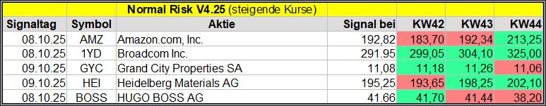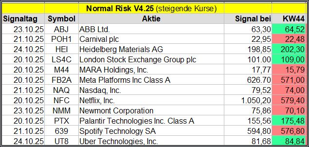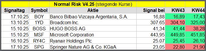 Den Kursverlauf der einzelnen Werte verfolge ich ab einem generierten Signal, über einen Zeitraum von 4 Wochen und mit einem wöchentlichen Update. (Kursiv geschriebene Texte sind in der Regel Texte aus der Vergangenheit bzw. sind Hinweise.)