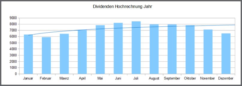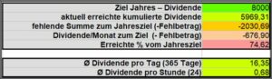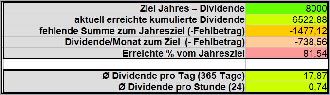 Um das Jahresziel zu erreichen, müssten jetzt in jedem der verbleibenden Monate noch mindestens 738,56€ (676,90€) an Dividende generiert werden, um die fehlenden 1477,12€ bis zum Jahresende ausgleichen zu können. Das ist könnte denkbar knapp werden…wobei ich davon ausgehen, dass die 8k nicht erreicht werden.