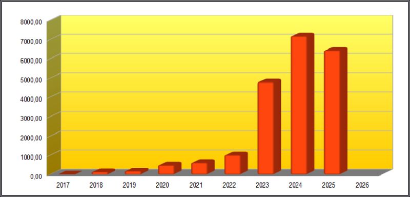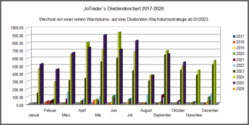 In der kompakten Übersicht der Jahresdividenden von 2017-2026 liegt das Jahr 2025 aktuell auf Platz 2, berechnet seit 2017 und es liegen noch 2 Monate vor uns. Eventuell wird also ein neues Hoch in 2025 erreicht, aber ob es für 8000€ an Dividenden reicht, bezweifle ich.