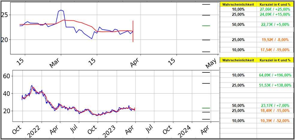 - Wahrscheinlichkeit 50%: Der durchschnittlich zu erwartende Mittelkurs liegt im Plus bei 23,17 € (+7,00%).
