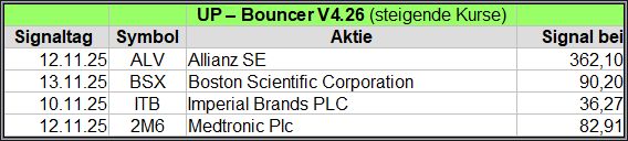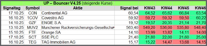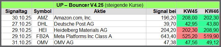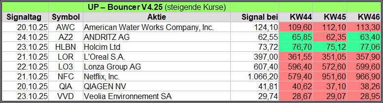 Nachfolgend die fortlaufenden UP-Bouncer-Ergebnisse der vergangenen 4 Wochen anhand denen jeder selbst prüfen kann, wie erfolgreich die eigene Auswahl aus den angebotenen Signal-Werten gewesen wäre.