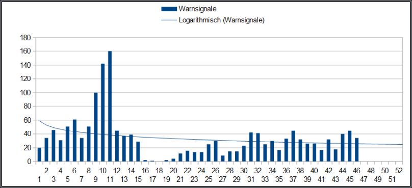 Nachfolgend die Übersicht der Warnsignale je Woche 2025. Diese liegen schon die 3. Woche über der Trendlinie. wieder klar über der Trendlinie.