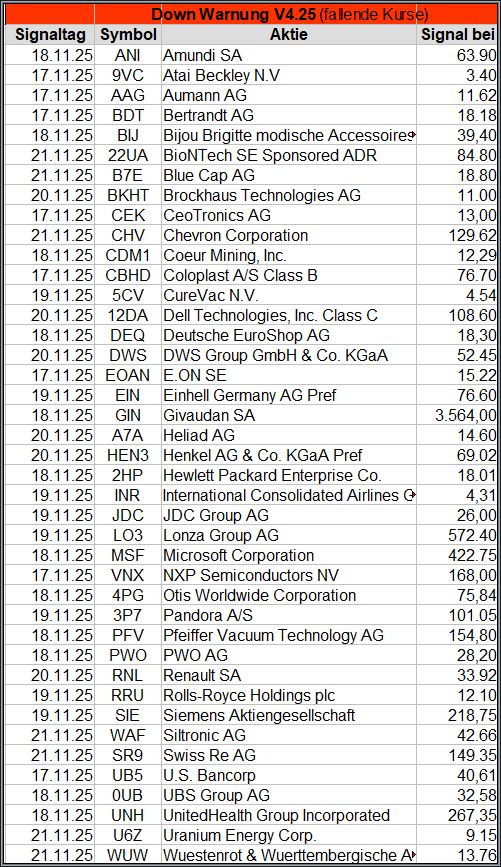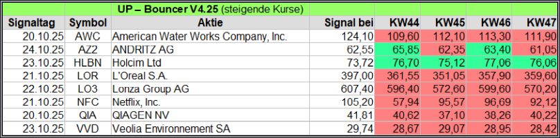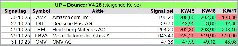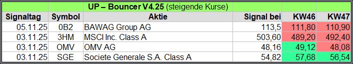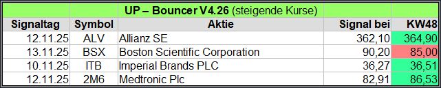 Nachfolgend die fortlaufenden UP-Bouncer-Ergebnisse der vergangenen 4 Wochen anhand denen jeder selbst prüfen kann, wie erfolgreich die eigene Auswahl aus den angebotenen Signal-Werten gewesen wäre.