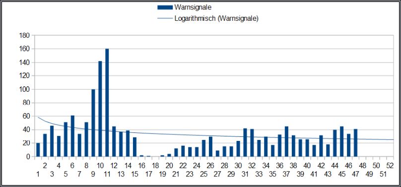 Nachfolgend die Übersicht der Warnsignale je Woche 2025. Diese liegen schon die 4. Woche über der Trendlinie und wie man sieht, ist das ein relativ zuverlässiges Warnsignal, dass sich etwas zusammenbraut.