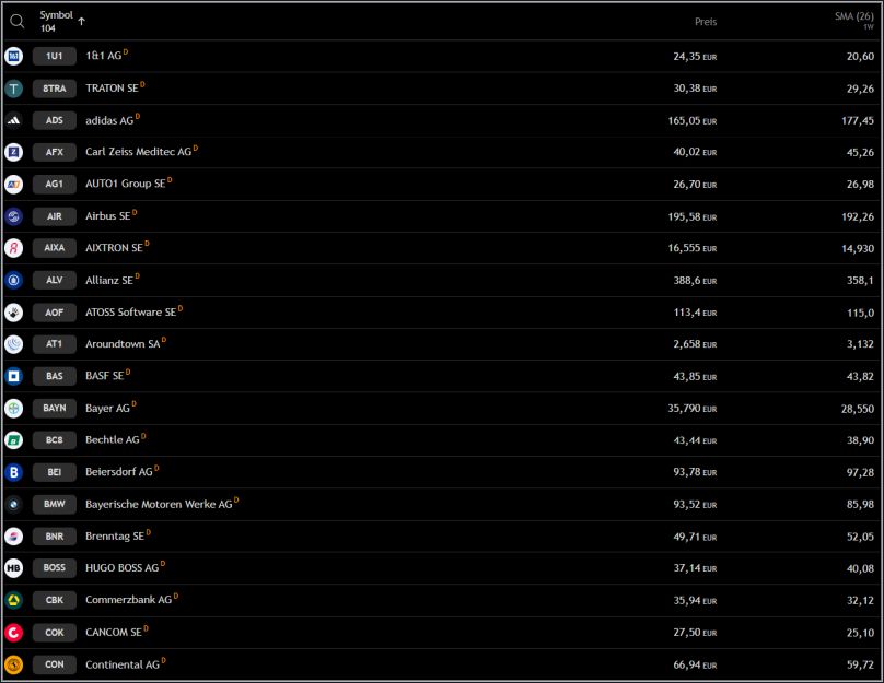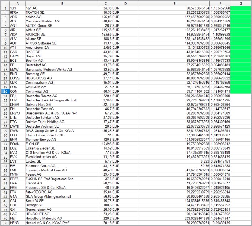 Zuerst lade ich eine List des kompletten HDax, wie nachfolgend abgebildet und exportiere diesen in eine Tabellenkalkulation.