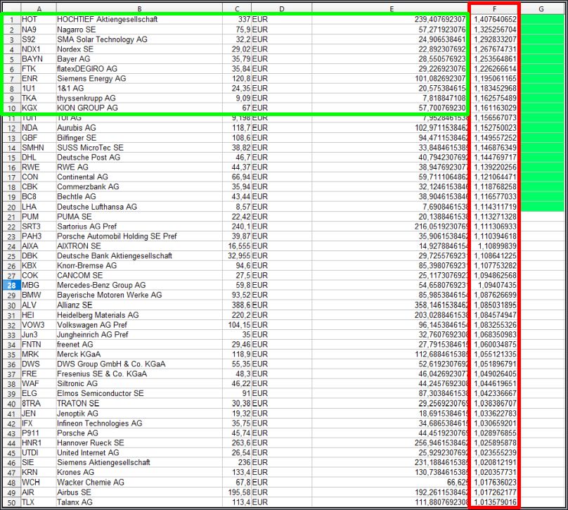 In der Spalte „F“ lasse ich den RSL Wert errechnen. Die grünen Felder markieren die Top 20.