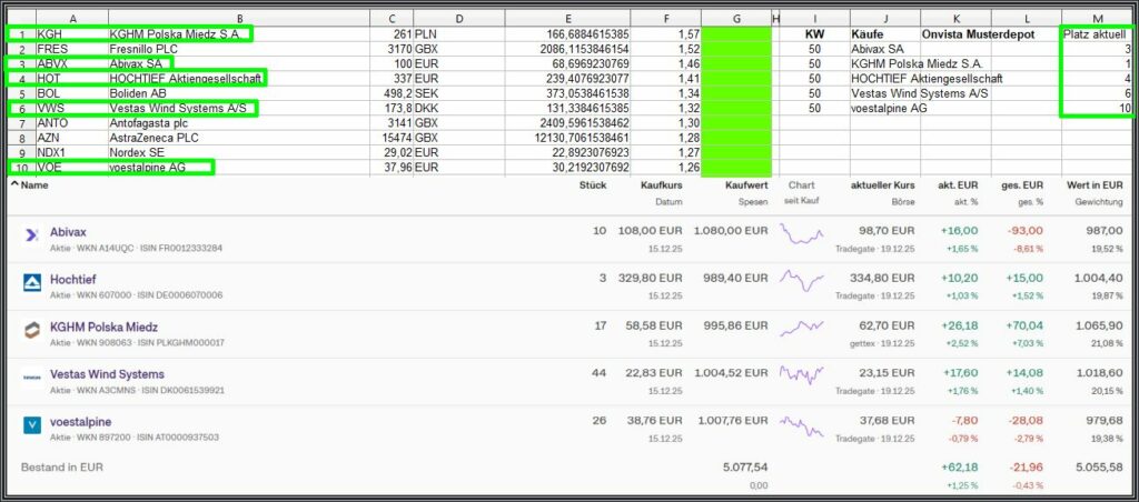 Der grüne Rahmen rechts, zeigt die aktuelle Platzierung, der 5 Werte. Sollte einer davon unter Platz 20 fallen auf Wochensicht, wird dieser am folgenden Montag ohne Wenn und Aber verkauft.