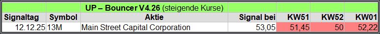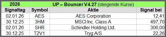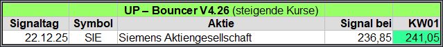Nachfolgend die fortlaufenden UP-Bouncer-Ergebnisse der vergangenen 4 Wochen anhand denen jeder selbst prüfen kann, wie erfolgreich die eigene Auswahl aus den angebotenen Signal-Werten gewesen wäre.
