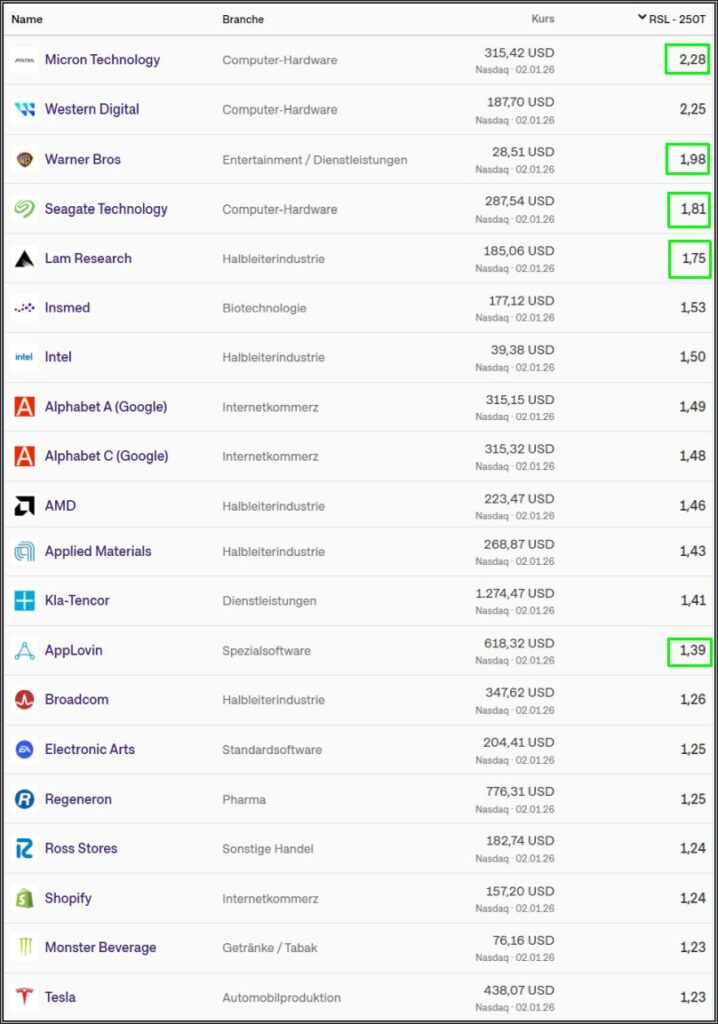 Relative Stärke (RSL) nach Levy Strategie – Nasdaq Muster-Depot