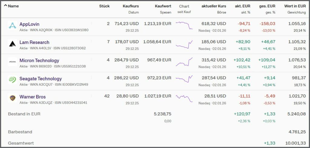 Nachfolgend mein Depot mit den am 29.12.25 „gekauften“ Werten. Der Gesamtbetrag wurde so gut wie möglich, gleichmäßig auf die 5 Werte verteilt.