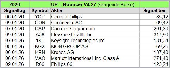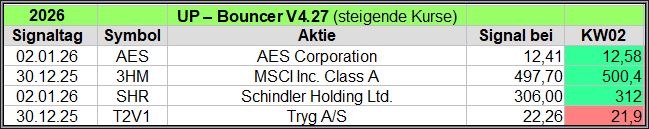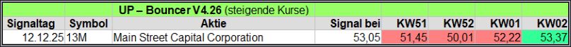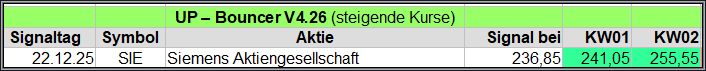 Nachfolgend die fortlaufenden UP-Bouncer-Ergebnisse der vergangenen 4 Wochen anhand denen jeder selbst prüfen kann, wie erfolgreich die eigene Auswahl aus den angebotenen Signal-Werten gewesen wäre.