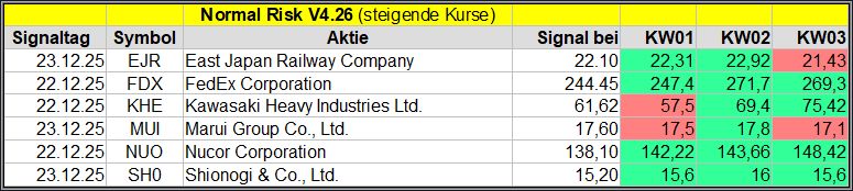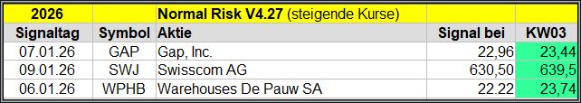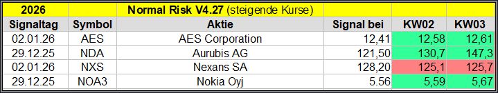 Den Kursverlauf der einzelnen Werte verfolge ich ab einem generierten Signal, über einen Zeitraum von 4 Wochen und mit einem wöchentlichen Update. (Kursiv geschriebene Texte sind in der Regel Texte aus der Vergangenheit bzw. sind Hinweise.)