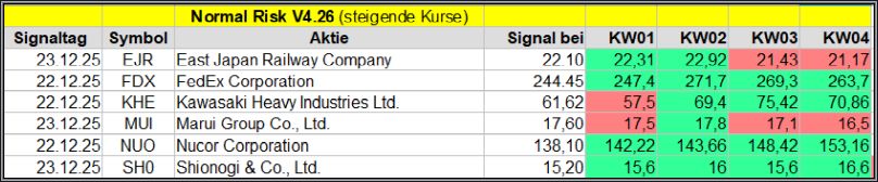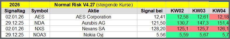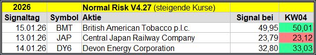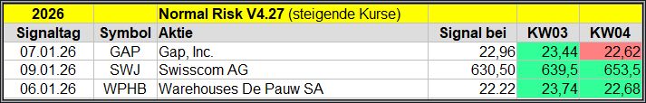 Den Kursverlauf der einzelnen Werte verfolge ich ab einem generierten Signal, über einen Zeitraum von 4 Wochen und mit einem wöchentlichen Update. (Kursiv geschriebene Texte sind in der Regel Texte aus der Vergangenheit bzw. sind Hinweise.)