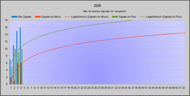 Hier wird eine kleine Statistik darüber gezeigt, wie viele Signale in den vergangenen 4 Wochen insgesamt generiert wurden und wie viele davon wöchentlich im Plus oder Minus liegen.