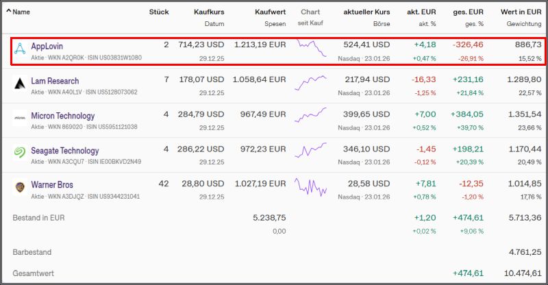 Allerdings hat die Aktie von AppLovin inzwischen den 19 Platz erreicht und hat bisher ein Minus von 232,15€ eingebracht. Dieses Minus wird aber von den anderen Werten locker ausgeglichen. Mal sehen, ob die Aktie nächste Woche rausfliegt.