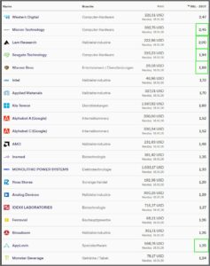 AppLovin hat die Top 20 verlassen und wird verkauft. Der Nachfolge – Kauf Western Digital, ist grün hinterlegt markiert.