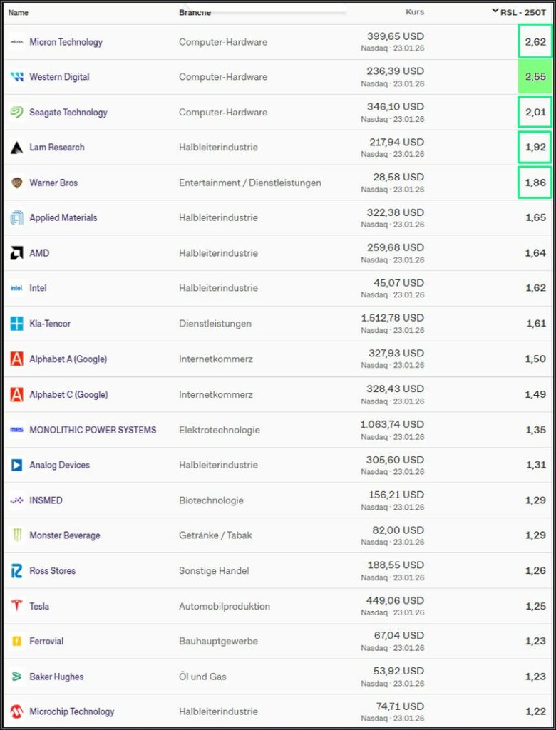 Hier die Nasdaq TOP 20 Liste der stärksten RSL Werte KW04