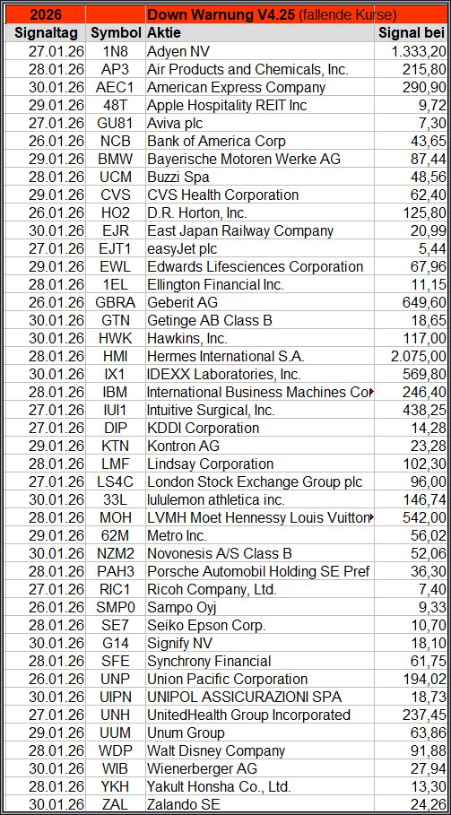 Dieser Screener setzt auf steigende Kurse und könnte auf einen neuen Trend nach oben hindeuten. Die Anzahl der Signale lässt auch einen Rückschluss auf den Gesamtmarkt zu, der möglicherweise bullischer wird, wenn viele „UP“ Signale generiert werden. Der Algorithmus wurde für 2026 überarbeitet , um der zunehmenden Volatilität zu begegnen.