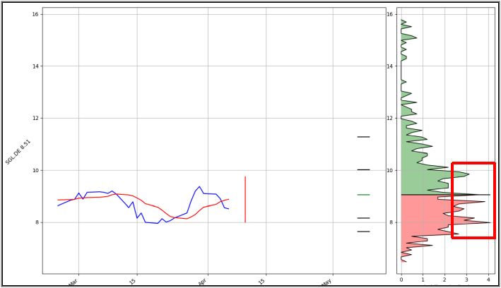 Auf Basis der letzten 1000 Kurse ergibt sich für den Wert aktuell die rechnerisch höchste Wahrscheinlichkeit, dass der Kurs bis auf 8€ nachgibt (höchste Spitze rechter Bereich).