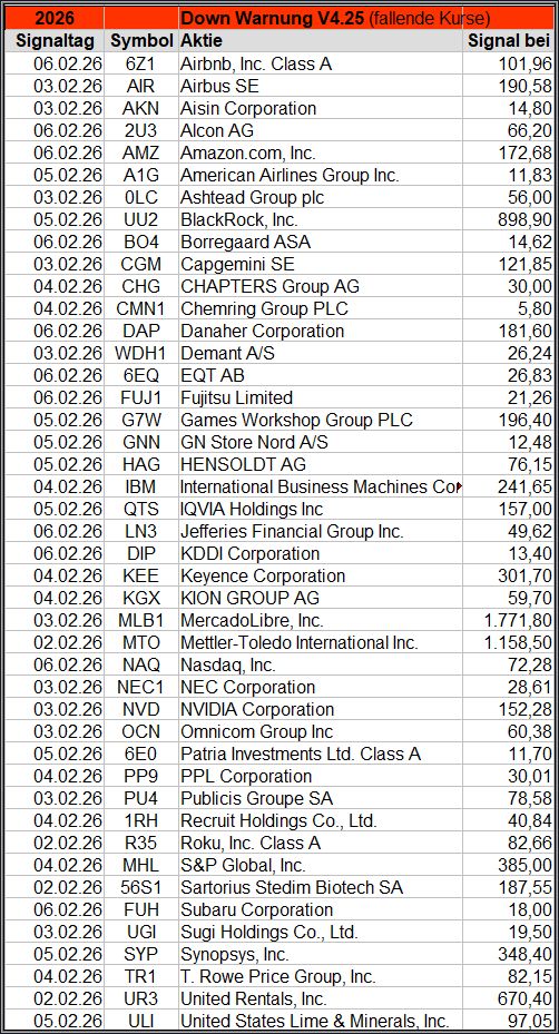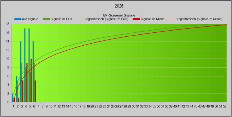 Dieser Screener setzt auf steigende Kurse und könnte auf einen neuen Trend nach oben hindeuten. Die Anzahl der Signale lässt auch einen Rückschluss auf den Gesamtmarkt zu, der möglicherweise bullischer wird, wenn viele „UP“ Signale generiert werden. Der Algorithmus wurde für 2026 überarbeitet , um der zunehmenden Volatilität zu begegnen.