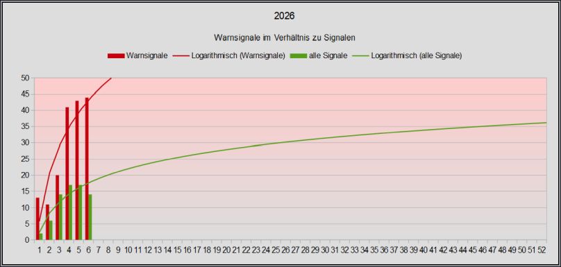 Hier werden die wöchentlichen Warnsignale mit Trendlinie und die Gesamtsignale angezeigt. Warnsignale, die über die logarithmische Trendlinie reichen, bedeuten ein möglicherweise eher schwieriges Umfeld.