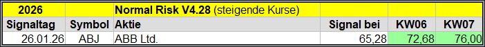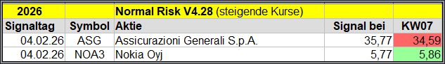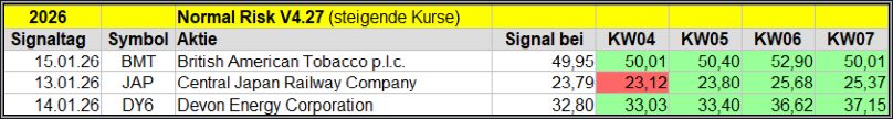 Den Kursverlauf der einzelnen Werte verfolge ich ab einem generierten Signal, über einen Zeitraum von 4 Wochen und mit einem wöchentlichen Update. (Kursiv geschriebene Texte sind in der Regel Texte aus der Vergangenheit bzw. sind Hinweise.)