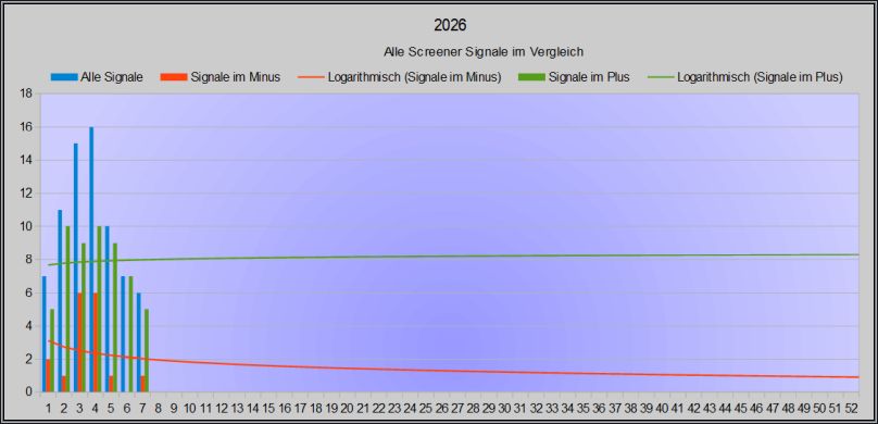 Hier wird eine kleine Statistik darüber gezeigt, wie viele Signale in den vergangenen 4 Wochen insgesamt generiert wurden und wie viele davon wöchentlich im Plus oder Minus liegen. Bisher dominieren die Signale, die im Plus liegen eindeutig.
