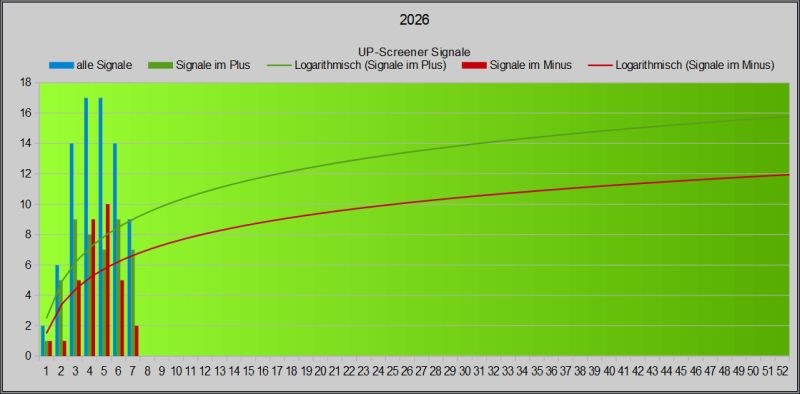 Dieser Screener setzt auf steigende Kurse und könnte auf einen neuen Trend nach oben hindeuten. Die Anzahl der Signale lässt auch einen Rückschluss auf den Gesamtmarkt zu, der möglicherweise bullischer wird, wenn viele „UP“ Signale generiert werden. Der Algorithmus wurde für 2026 überarbeitet , um der zunehmenden Volatilität zu begegnen.