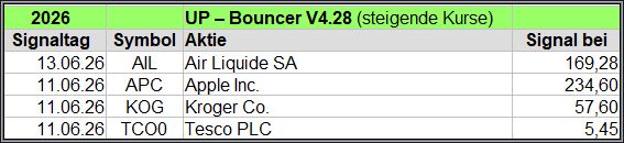 Nachfolgend die fortlaufenden UP-Bouncer-Ergebnisse der vergangenen 4 Wochen anhand denen jeder selbst prüfen kann, wie erfolgreich die eigene Auswahl aus den angebotenen Signal-Werten gewesen wäre. Bei den Signalen handelt es sich nur um eine Vorauswahl, die man selbst prüfen und auf eigenes Risiko, nutzen könnte.